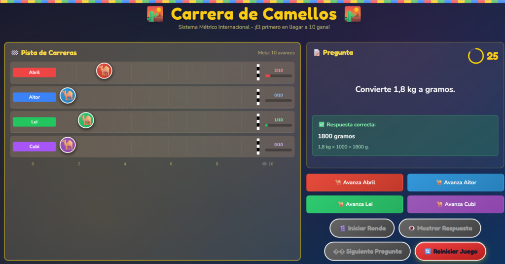 Estos días compartí en redes un juego online tipo feria: una carrera de camellos para 4 jugadores, donde se avanza acertando preguntas del Sistema Métrico Internacional (metros, gramos, litros y conversiones). Y la pregunta que más me habéis hecho no ha sido “¿cuántos metros son…?” 😄, sino: